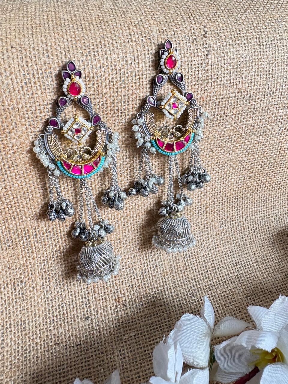 Statement earrings , adorned with kundan and meenakari pieces. Finished in golden and silver polish, this versatile pair is handcrafted in German silver, perfect for weddings, festivals, and cultural celebrations.