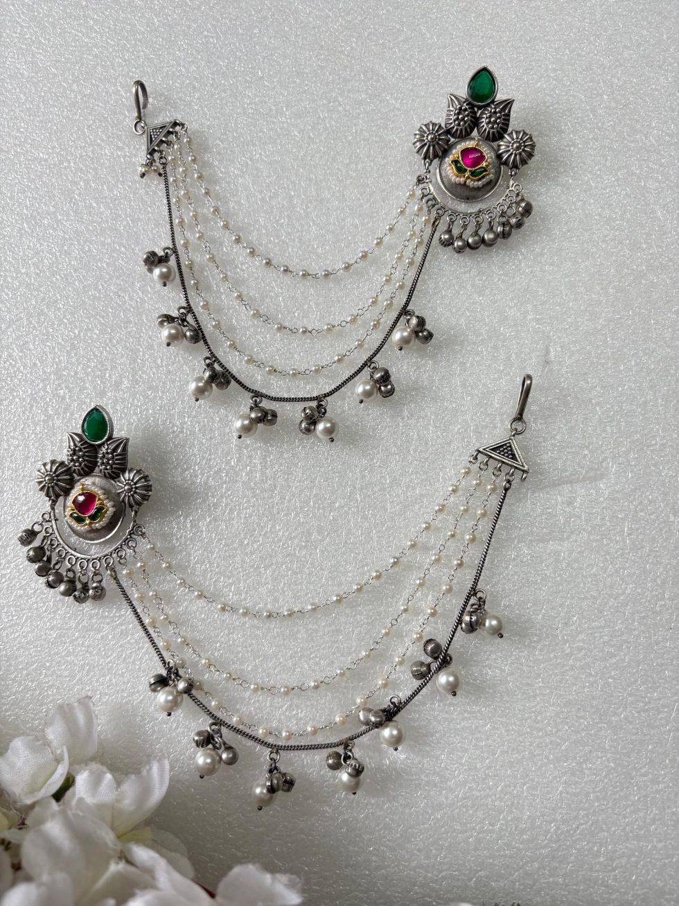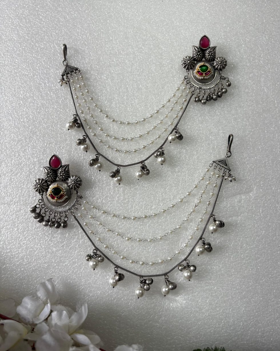 Statement earrings with meenakari and kundan, featuring Kashmiri-inspired design and ear chains. Handcrafted in German silver, perfect for weddings, festivals, and traditional celebrations.