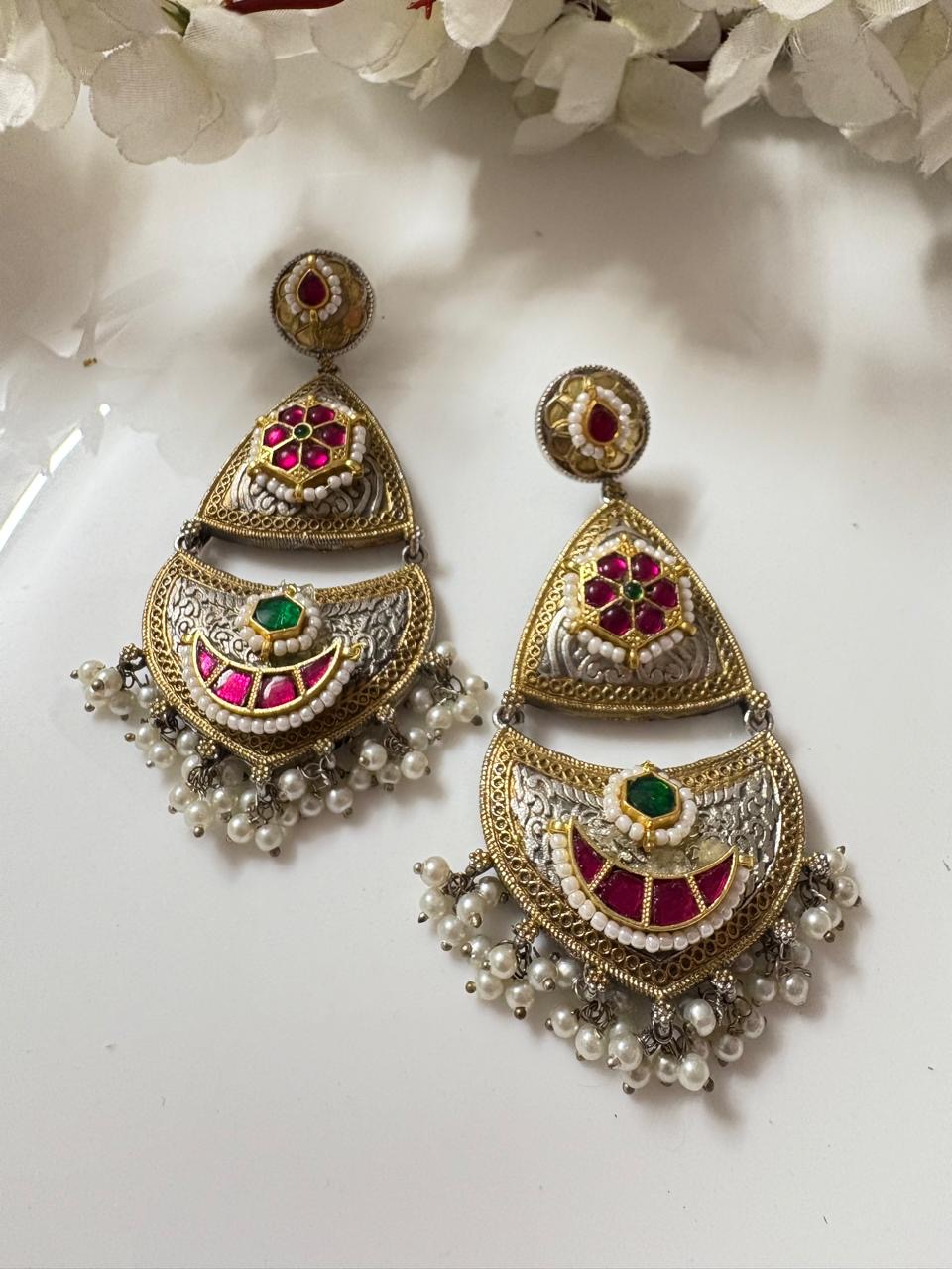 Statement earrings , adorned with kundan and meenakari pieces. Finished in golden and silver polish, this versatile pair is handcrafted in German silver, perfect for weddings, festivals, and cultural celebrations