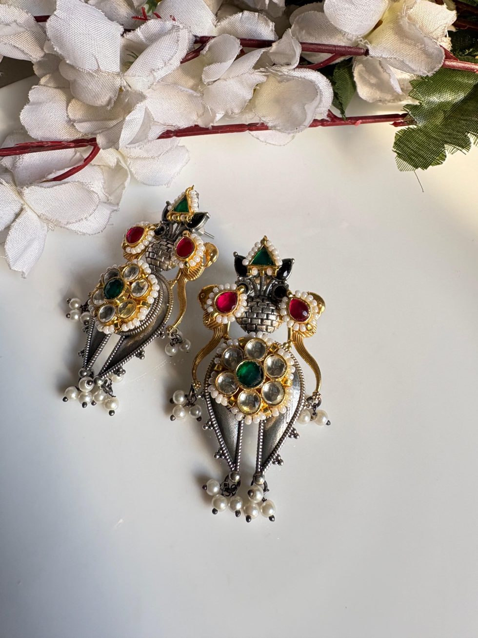 Statement earrings , adorned with kundan and meenakari pieces. Finished in golden and silver polish, this versatile pair is handcrafted in German silver, perfect for weddings, festivals, and cultural celebrations