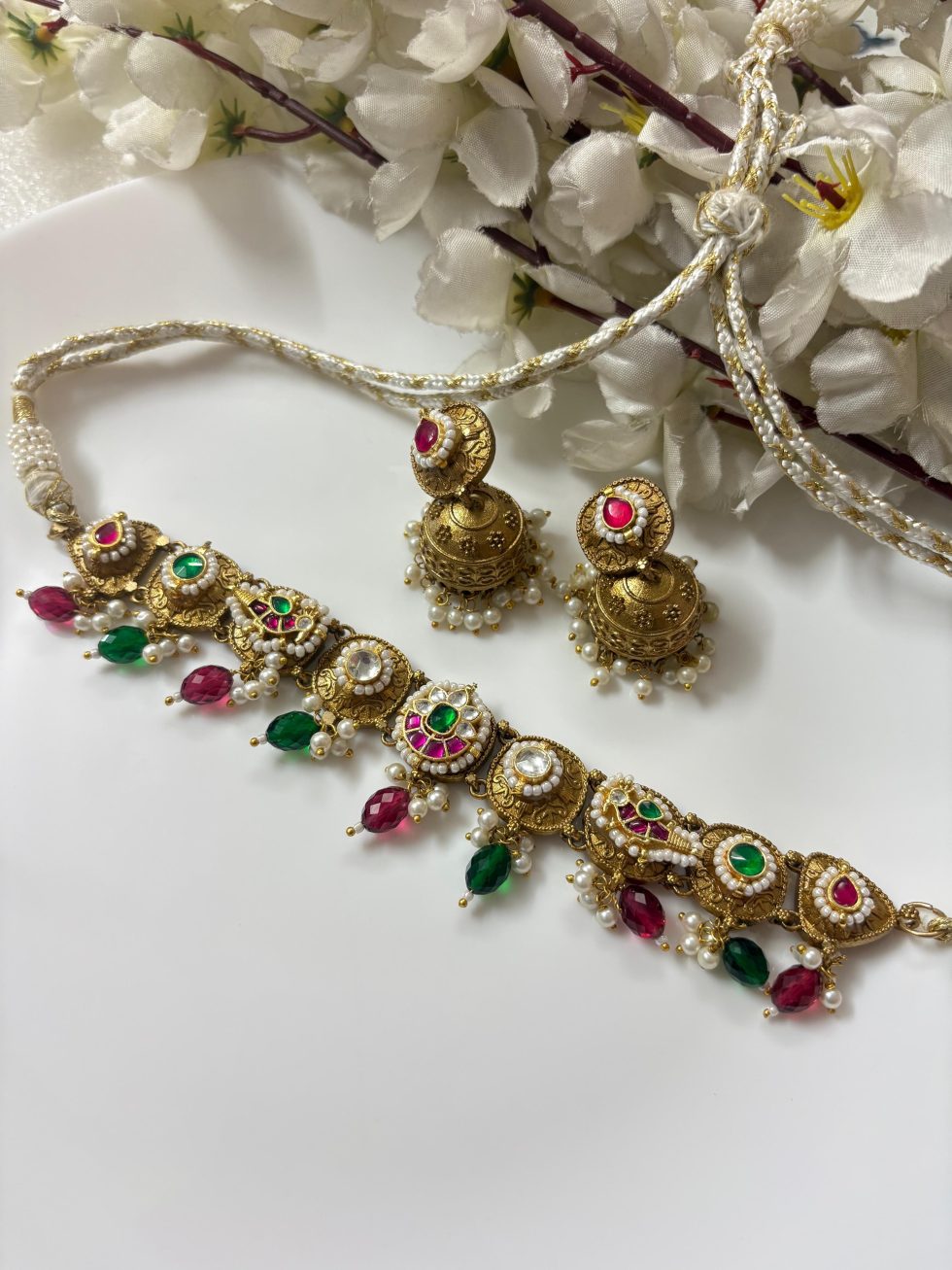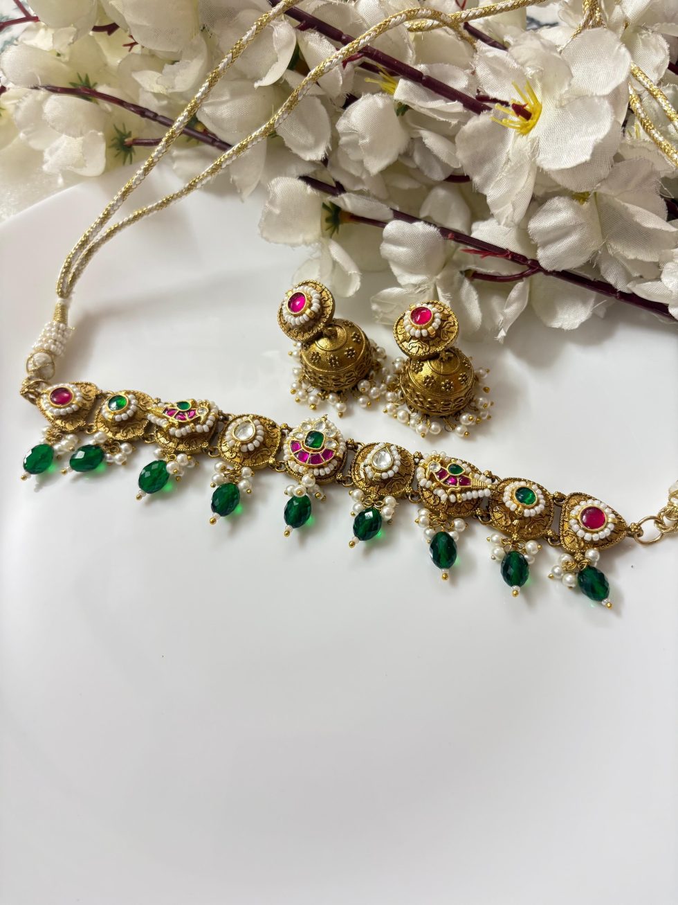 Ruby Green Kundan Fusion Choker Set With Jhumki