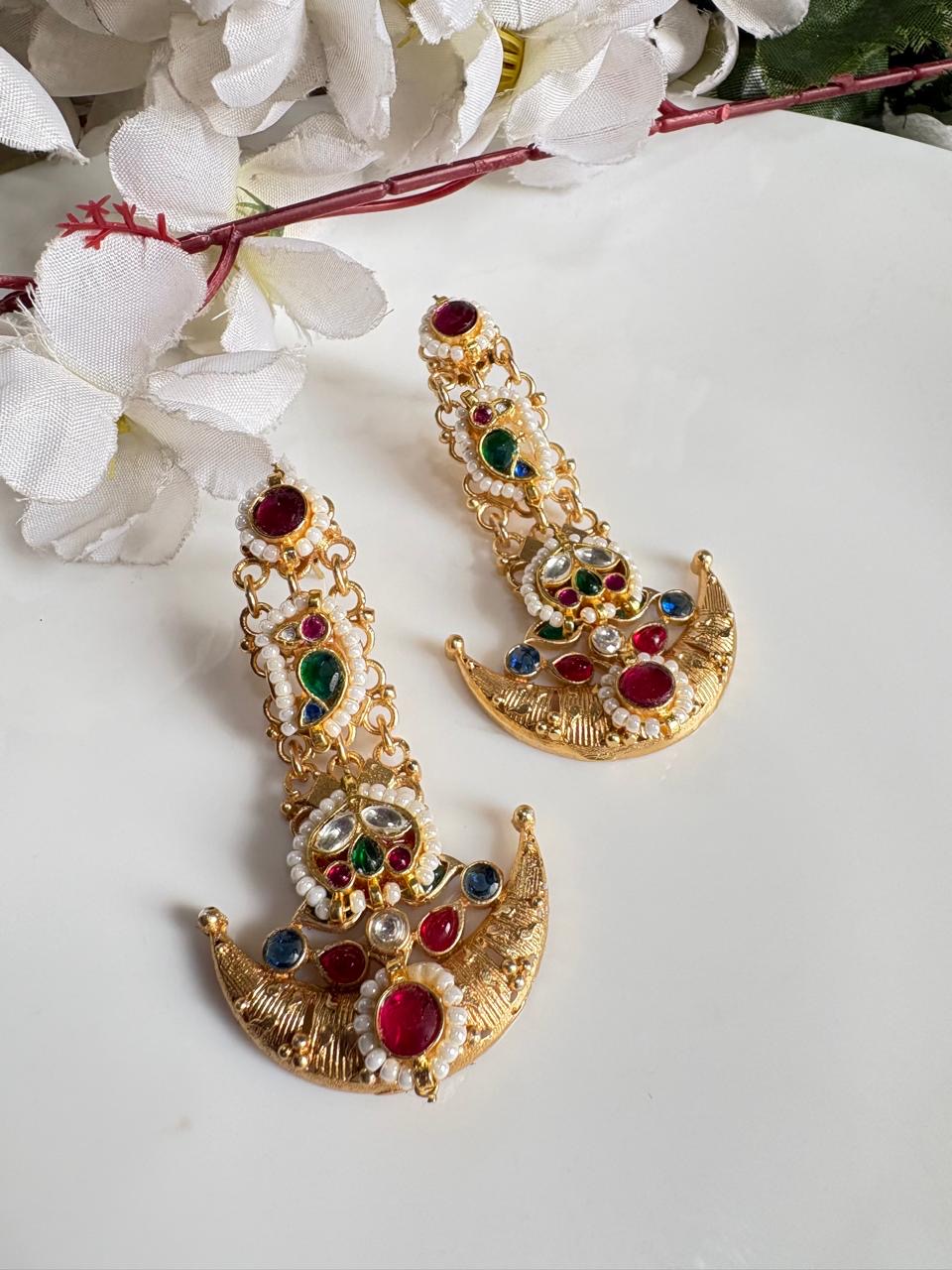 Statement earrings , adorned with kundan and meenakari pieces. Finished in golden and silver polish, this versatile pair is handcrafted in German silver, perfect for weddings, festivals, and cultural celebrations.