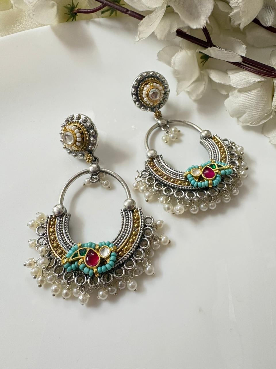 Statement earrings , adorned with kundan and meenakari pieces. Finished in golden and silver polish, this versatile pair is handcrafted in German silver, perfect for weddings, festivals, and cultural celebrations