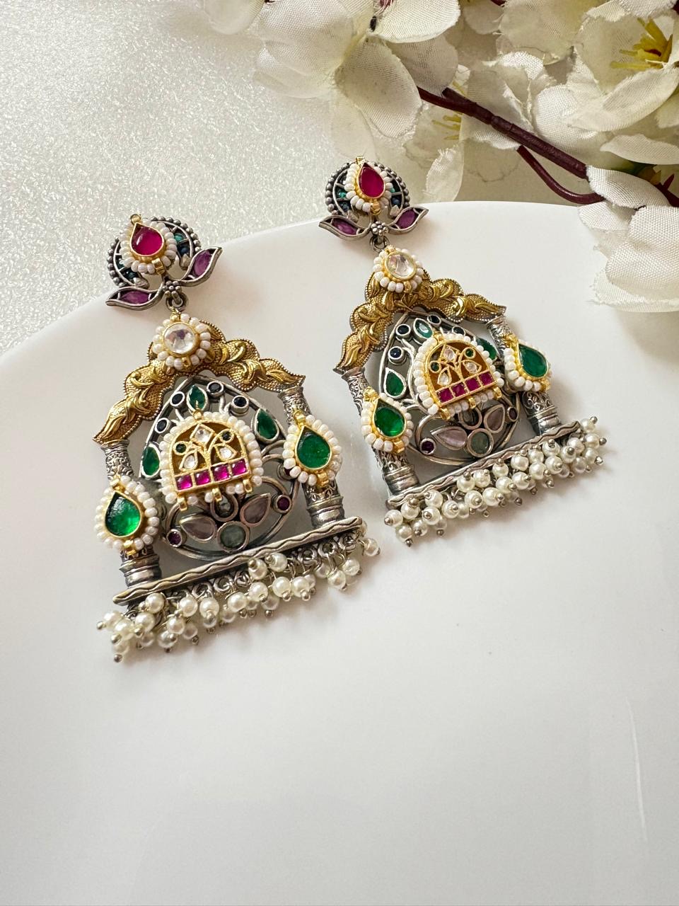 Statement earrings with adorned with kundan and meenakari pieces. Finished in golden and silver polish in German silver, perfect for weddings, festivals, and cultural celebrations