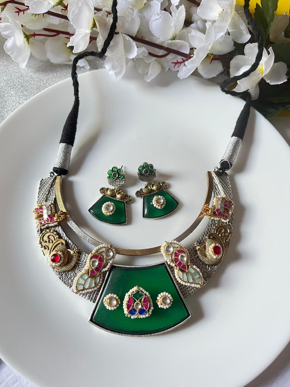 Royal Green Kundan Dualtone Hansli Style Necklace Set